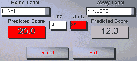 Here you can enter any two teams, any line and click the predict button and MrCFB will tell you it's predicted score and if it is a play (if it is MrCFB changes the background to red.) An Over Under play will result in the Over / Under value background changing to red (The math in determining if it is an Over or Under play is left up to you).